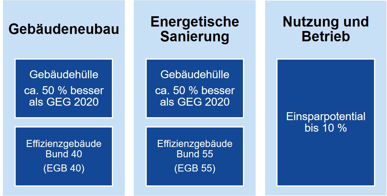 Neben dem Gebäudebetrieb, in dem Einsparpotenziale von bis zu zehn Prozent erwartet werden, hat die Anwendung von ambitionierten Energieeffizienzstandards bei Neubaumaßnahmen und Bestandssanierungen besondere Bedeutung.
