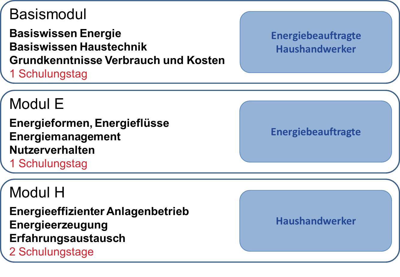 Während für die Energiebeauftragten die Themen Energiecontrolling, Energiemanagement und Nutzerverhalten im Vordergrund der Veranstaltungen stehen, sind bei den Haushandwerkerinnen Haushandwerkern eine Vertiefung des Grundwissens im Bereich des energieeffizienten Betriebs der haustechnischen Anlagen sowie das Thema Energieerzeugung Schwerpunkte der Schulungsinhalte.