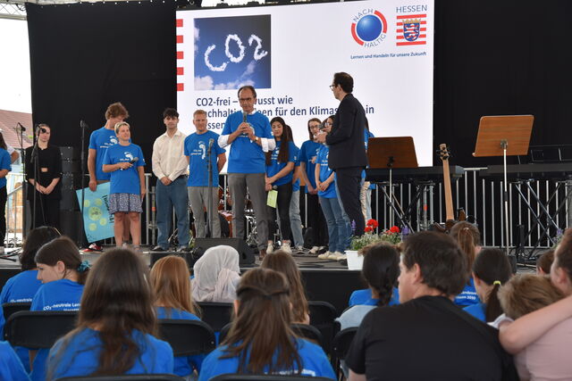Den Auftakt gaben die Schülerband und der Popchor der Schule. Schülerinnen und Schüler zeigten in einem Rollenspiel, wie sie sich im Fach Politik und Wirtschaft auf ganz besondere Weise mit dem Thema Windkraft beschäftigt haben. Im Gespräch mit hr-Moderator Bastian Korff stellten Finanzminister Michael Boddenberg und die stellvertretende Schulleiterin, Julia Lesche die CO2-neutrale Landesverwaltung und Klimaschutzmaßnahmen der Schule vor. Zum Abschluss hieß es Bühne frei für die neue Choreographie der Tanzgruppe der Friedrich-Ebert-Schule.