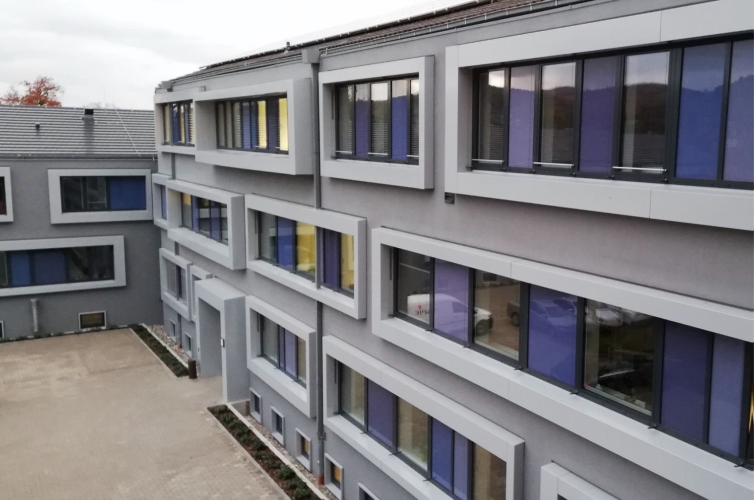 Alle Fassadenflächen sowie auch die Gebäudedächer und Geschossdecken wurden wärmegedämmt. Zudem sind auf dem Dach des Gebäudes eine PV-Anlage und im Keller eine Holzpelletsanlage installiert worden. Die Fenster und Außentüren wurden gegen dreifach verglaste Alu-Elemente ausgetauscht. Jeweils ein äußerer und innerer Sonnenschutz sind ebenso Teil des energetischen Konzepts und tragen zur Verbesserung der Arbeitsbedingungen bei.