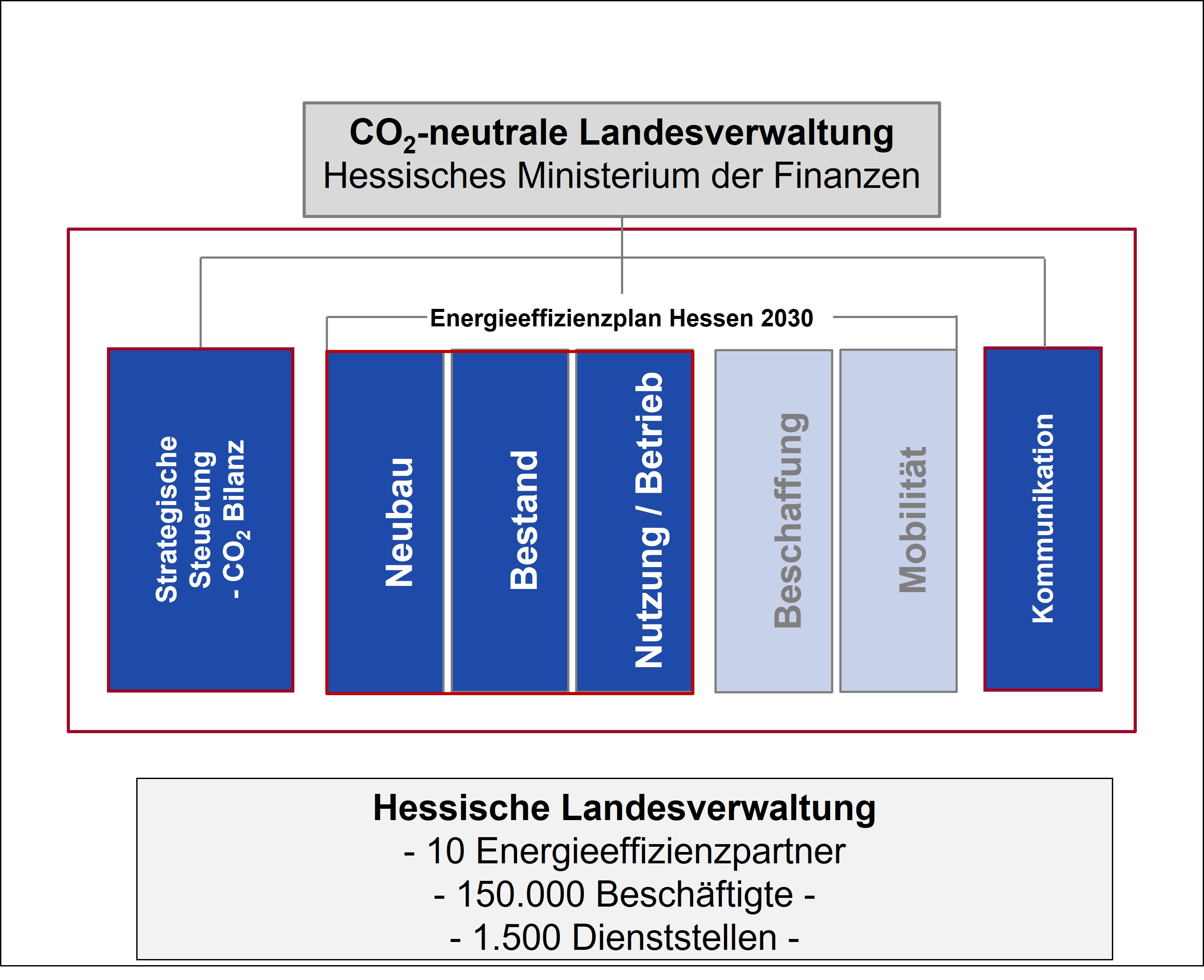 Zuständig für die CO2-neutrale Landesverwaltung ist das Hessische Ministerium der Finanzen. In regelmäßiger Abstimmung und mit dem Ziel der Bündelung der Maßnahmen trifft ein interministerielles Steuerungsgremium Entscheidungen über Maßnahmen und zu Konzepten, um eine zielgerichtete Weiterentwicklung zu gewährleisten. Die operative Umsetzung der Maßnahmen übernimmt die Stabsstelle „CO2-neutrale Landesverwaltung“. Kernbereich ihrer Aufgaben ist der Energieeffizienzplan Hessen 2030 mit den drei Maßnahmenschwerpunkten Neubau, Bestandsbau und Nutzung und Betrieb. Auch bei der bei der Beschaffung von Dienstleistungen und Produkten sowie bei der Mobilität verfolgt das Land verschiedene Maßnahmen zur Reduzierung und Vermeidung von CO2-Emissionen.